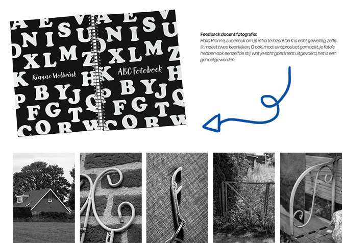 Ook zie je een opdracht die ik in het eerste jaar van mijn opleiding voor het vak fotografie kreeg. Het ABC fotoboek waarbij we alle letters van het alfabet mochten fotograferen en er een fotoboek van hebben gemaakt. Ik vind het restultaat zelf heel leuk geworden.
