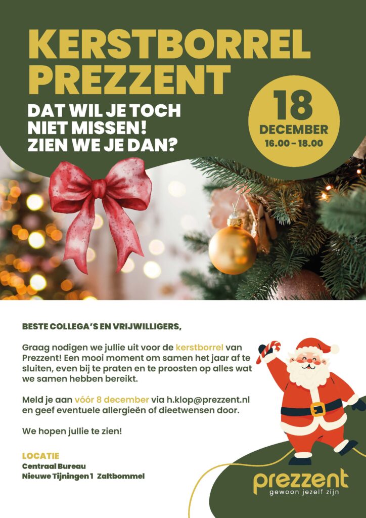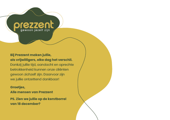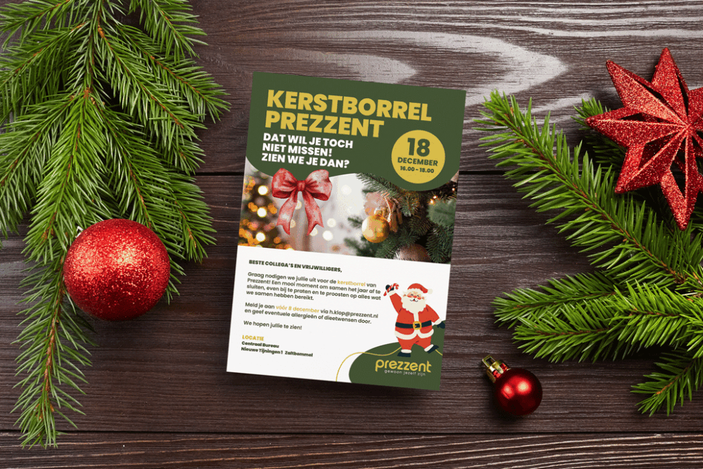 Voor Prezzent heb ik een uitnodiging voor de kerstborrel ontworpen. De uitnodiging moest een warme, feestelijke sfeer uitstralen, maar wel aansluiten bij de huisstijl en uitstraling van de organisatie. Ook heb ik een bedankkaart ontworpen waarmee Prezzent hun vrijwilligers kon bedanken voor hun inzet.